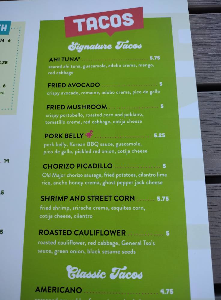 beer battered pollack, guacamole, pineapple habanero crema, tropical pico